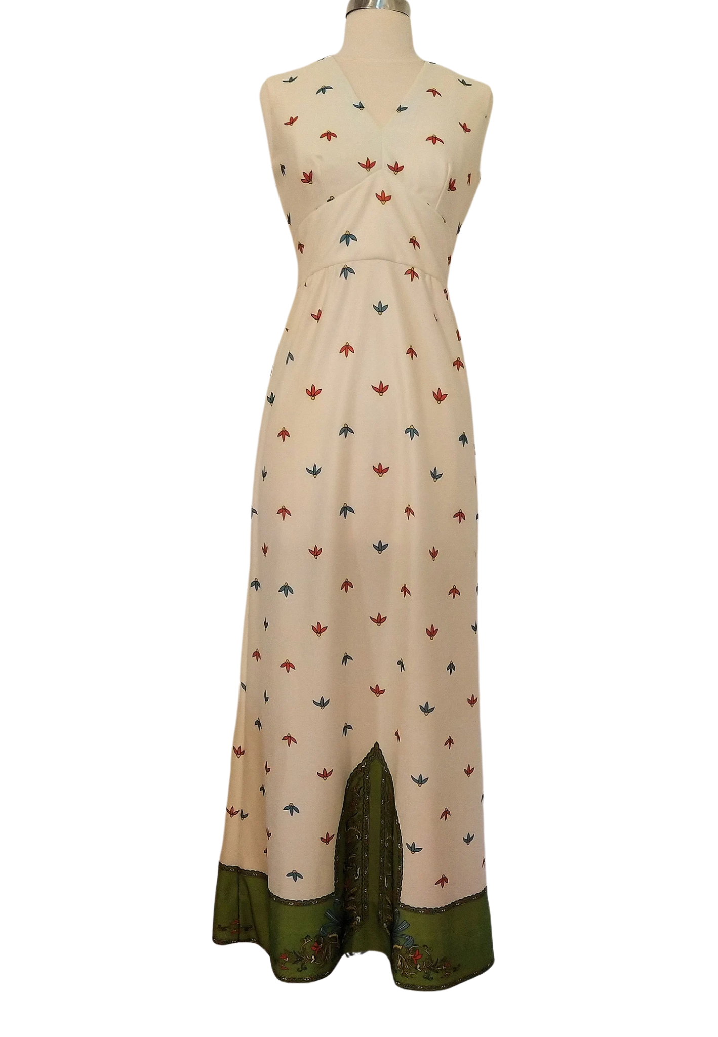Full length sleeveless jersey vintage dress by Leslie Fay in colors yellow, blue, red, adorable motif design all over on a cream background; all around paisley print towards the bottom; belt can be tied in front or back.In excellent conditionMeasurements:Bust: 34″Shoulders: 13-1/2″Waist: 26″Hips: 36″Belt: 31-1/2″Length: 51-1/2″