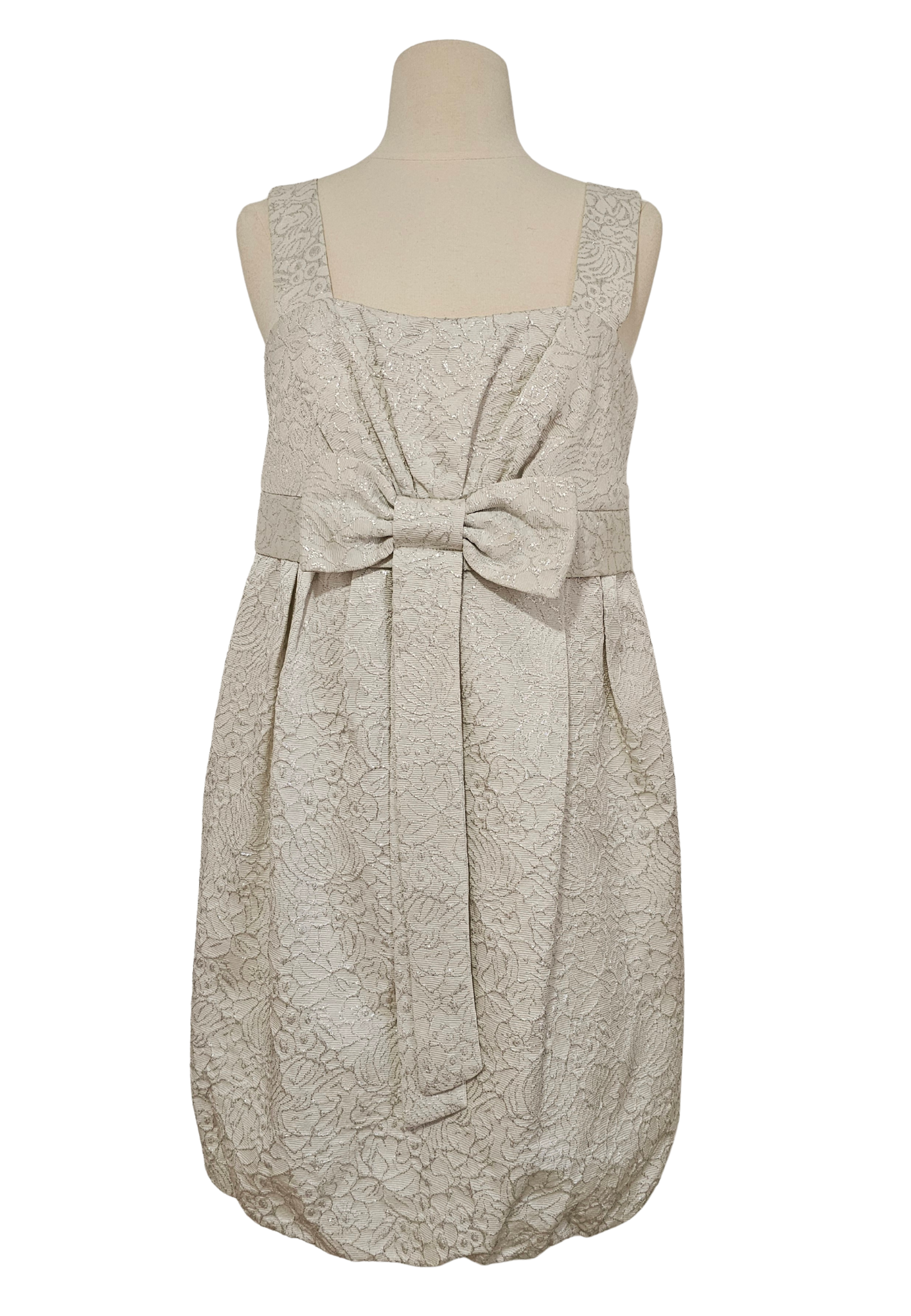 Raised silver metallic treading on a off-white background, pleated dress features a front bow detail, thick shoulder straps, a slight bubble hemline. Made from acetate/cotton, 100% polyester lining. Hook/zipper back closure. (NOTE: minor stains on front bow and on back near hemline-see last photos) Made in USA Measurements: Shoulders: 12″ Bust: 30″ Waist: 35″ Hips: 36″ Length: 34″