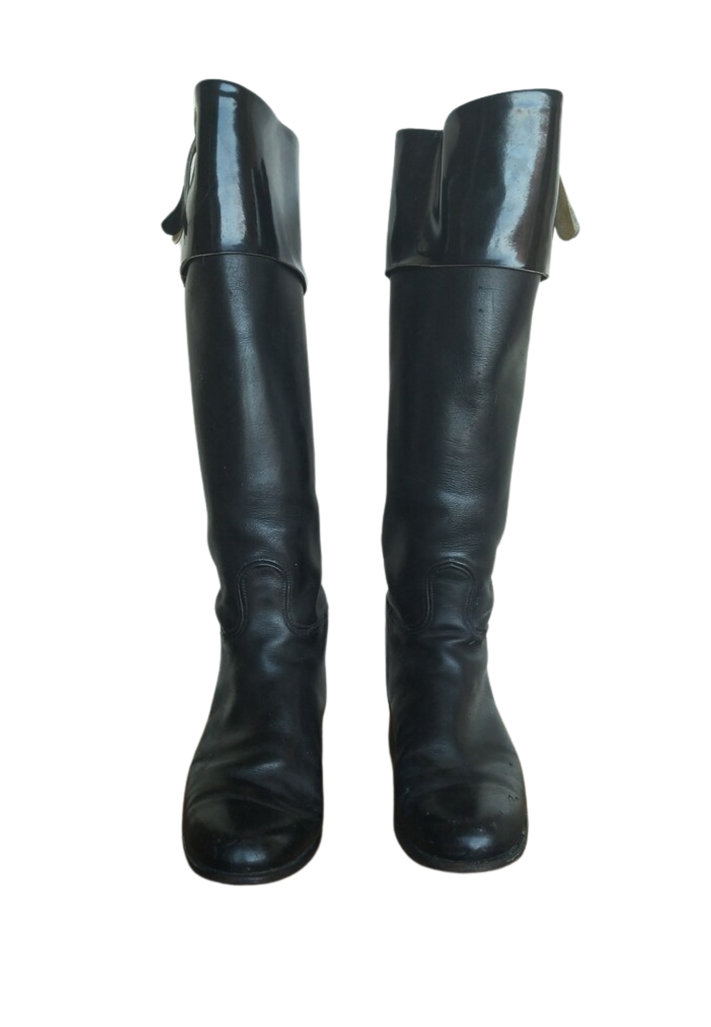 Vintage leather boots are in very good condition; patent leather trim. Made of a thick/stiff leather.** PLEASE note condition of boots before purchase.With the right restoration process these boots could have a new beautiful look.Era of boots unknown; no maker labelMeasurements: will fit a size 7-1/2 or 8 (please refer to measurements)Shaft Height: 18″Calf Circumference: 14-3/8″Angle Circumference: 12-3/4″Boot Sole Length: 10-5/8″Heel Height: 0.875
