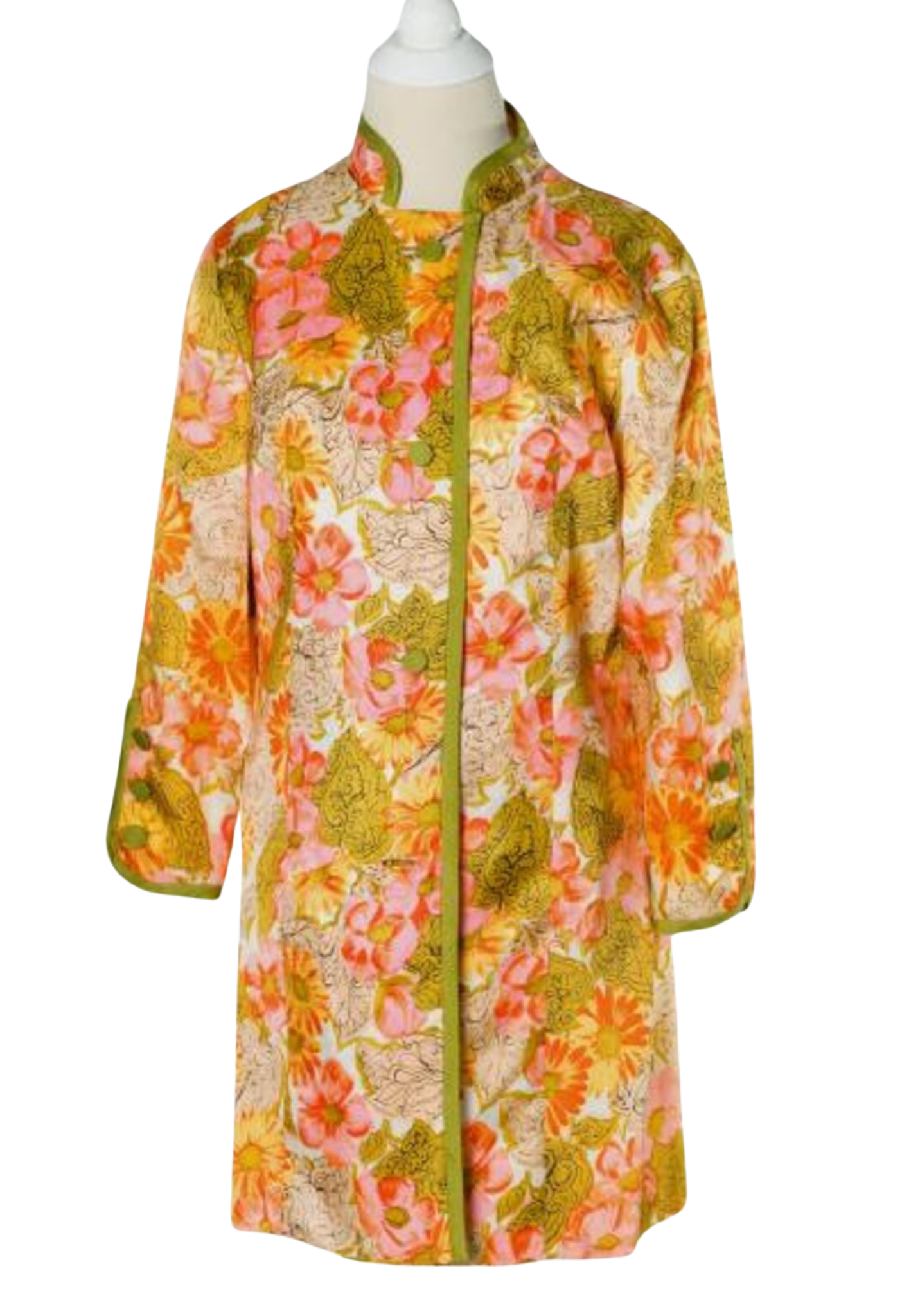 This versatile light-weight silk outfit in beautiful shades of pink, yellow, orange and green can be worn as a dress or coat. Mandarin collar and cuffs trimmed with green edging and 4 fabric-covered buttons closes in front. Metal snap closes at neck.Designer/Label: Anita Modes/ILGWU Union LabelCondition: ExcellentMeasurements:Bust: 40”Waist: 38”Sleeve: 18-1/2Shoulder: 16”Hips: 40”Length: 33”