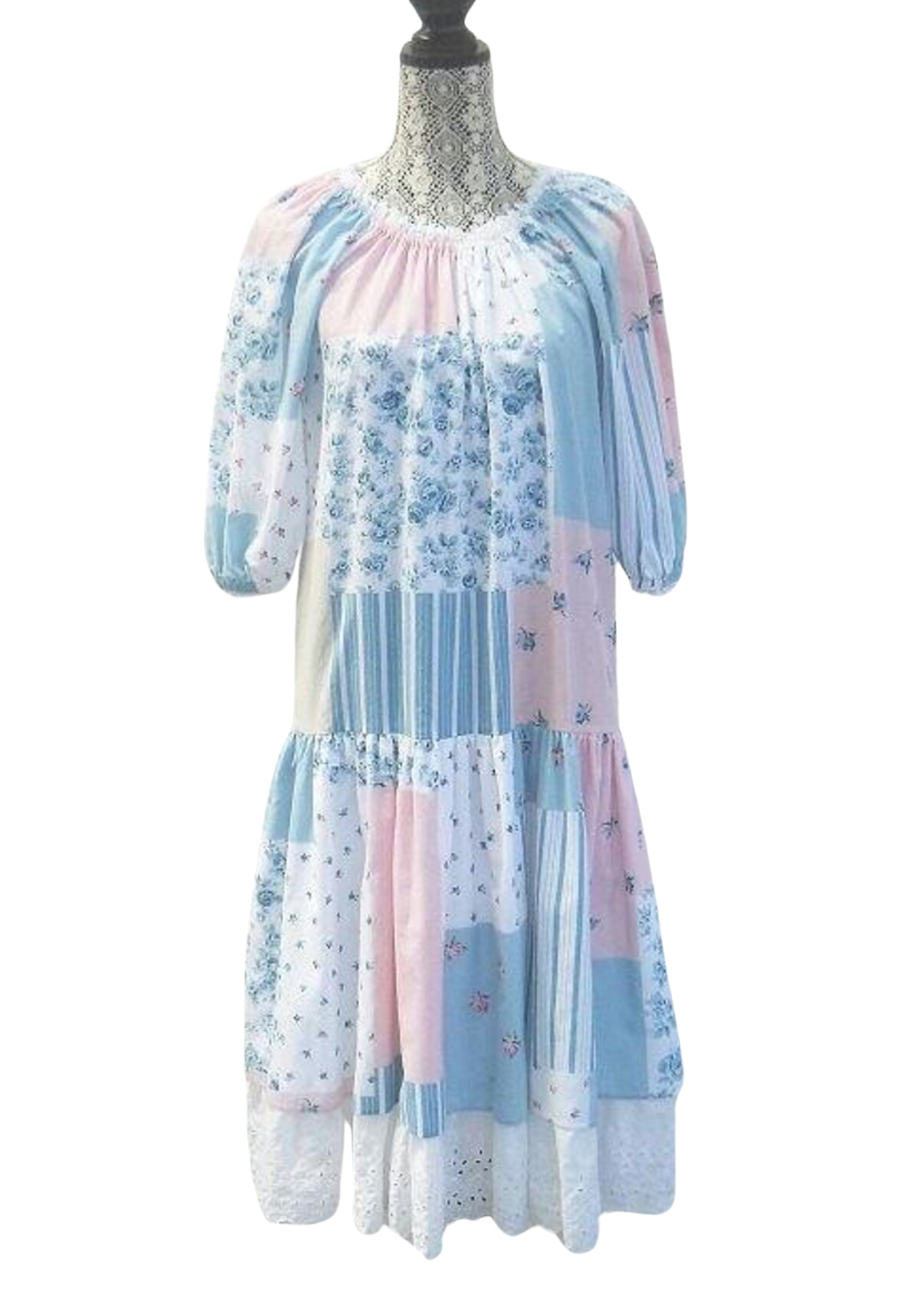 Cute vintage cotton loose fit dress from the circa 80’s by “Leigh Karmitz for Periphery/Lord & Taylor”. Great pastel shades in soft blue and pink, side pockets, quarter length sleeves, elastic around the neck and cuffs.Designer/Label: Leigh Karmitz for Periphery & Lord & TaylorCondition: ExcellentMeasurements:Bust: 36”Waist: Up to 36”Shoulder: 16”Hips: 40”Length:44