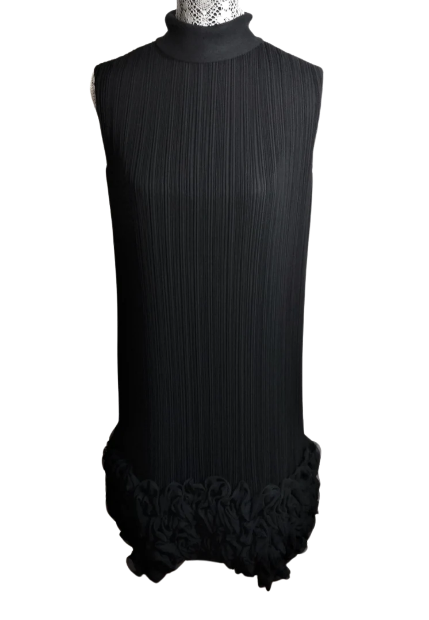 Stunning and cute black accordion pleated cocktail dress by “Carlye” with a gorgeous full ruffle at the hemline. Dress is sheer made from polyester on top of a black slip lining; closes with five fabric covered buttons down the back. NOTE: Thread to attach eye hook missing; lining have some discoloration due to age.Designer/Label: Carlye (Original tags attached)Condition: ExcellentMeasurements:Bust 38″Shoulders 16″Waist 34″Hip 38″Length: 38″