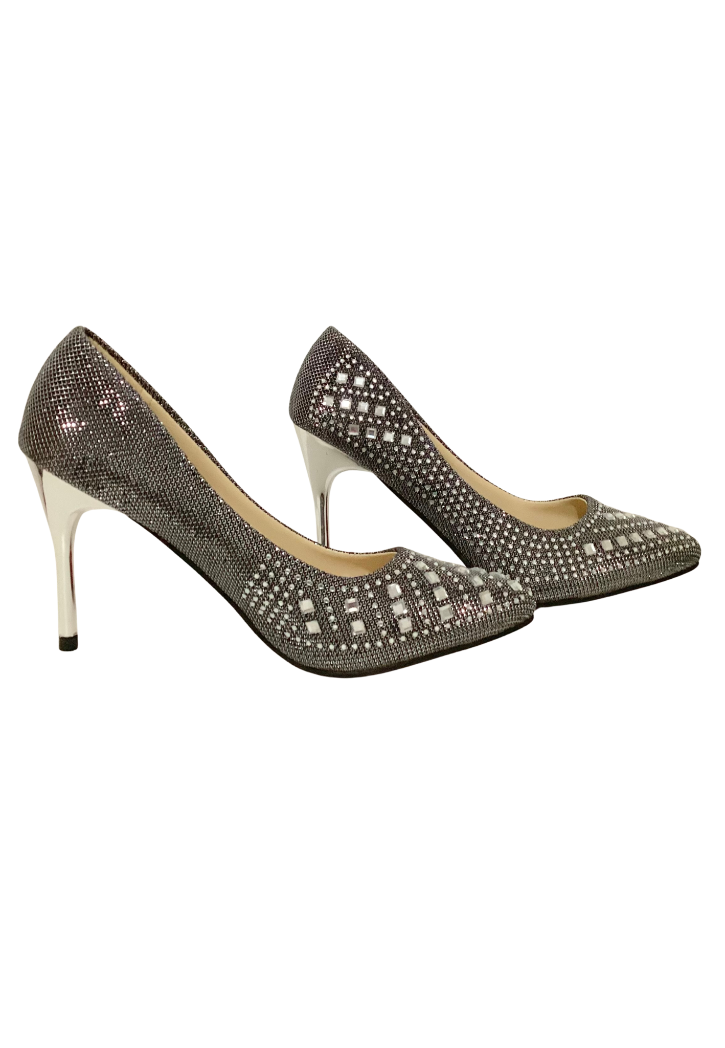 Classic silver pumps featuring a shiny metallic stiletto heel, upper of the shoe covered in sparkly rhinestones. In excellent condition and looks never worn.Designer: LejiaojiaoMeasurements: (Label Size 39)Interior Length: 10″Exterior Ball: 2-7/8″Heels: 3-3/4″